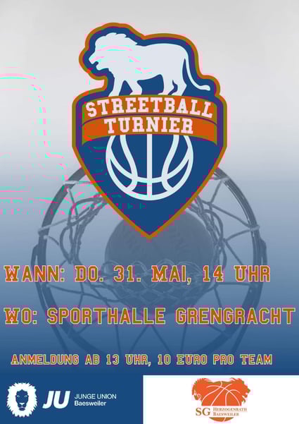 Auch in diesem Jahr veranstaltet die JU Baesweiler in Kooperation mit der SG Herzogenrath/Baesweiler das 3on3 Streetballturnier in der Grengrachthalle Baesweiler.